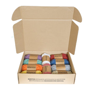 Te recomendamos este pack de 10 ovillos Rústica surtidos, hilado de dos hebras de ropa reciclada por Ecocitex.