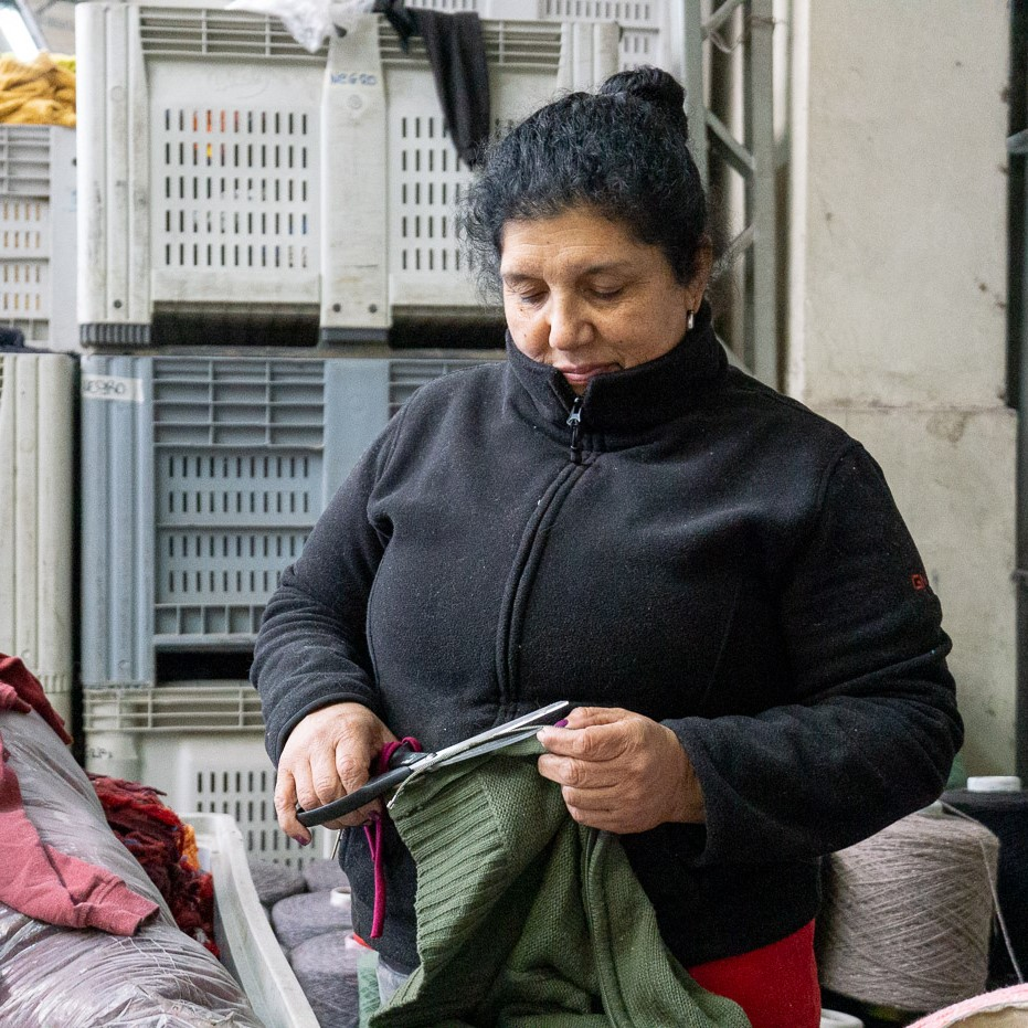 Todas las prendas son revisadas y clasificadas por color a mano.