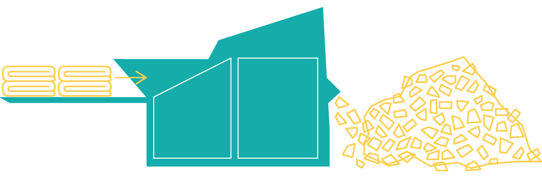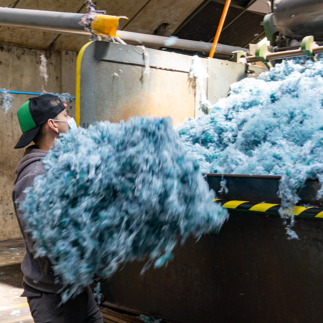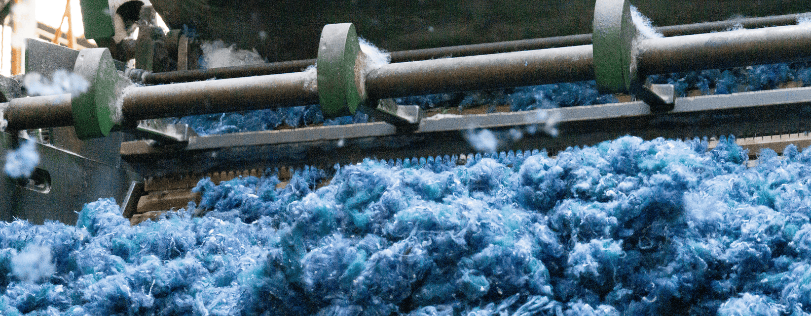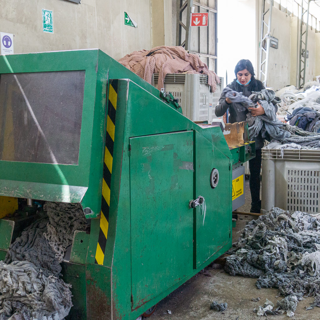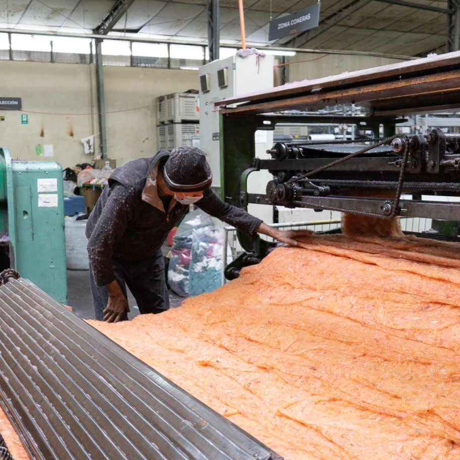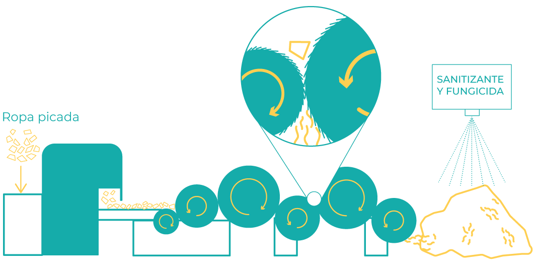 Desmenuzamos la ropa cortada, convirtiéndola en vellón textil para luego sanitizarlo.