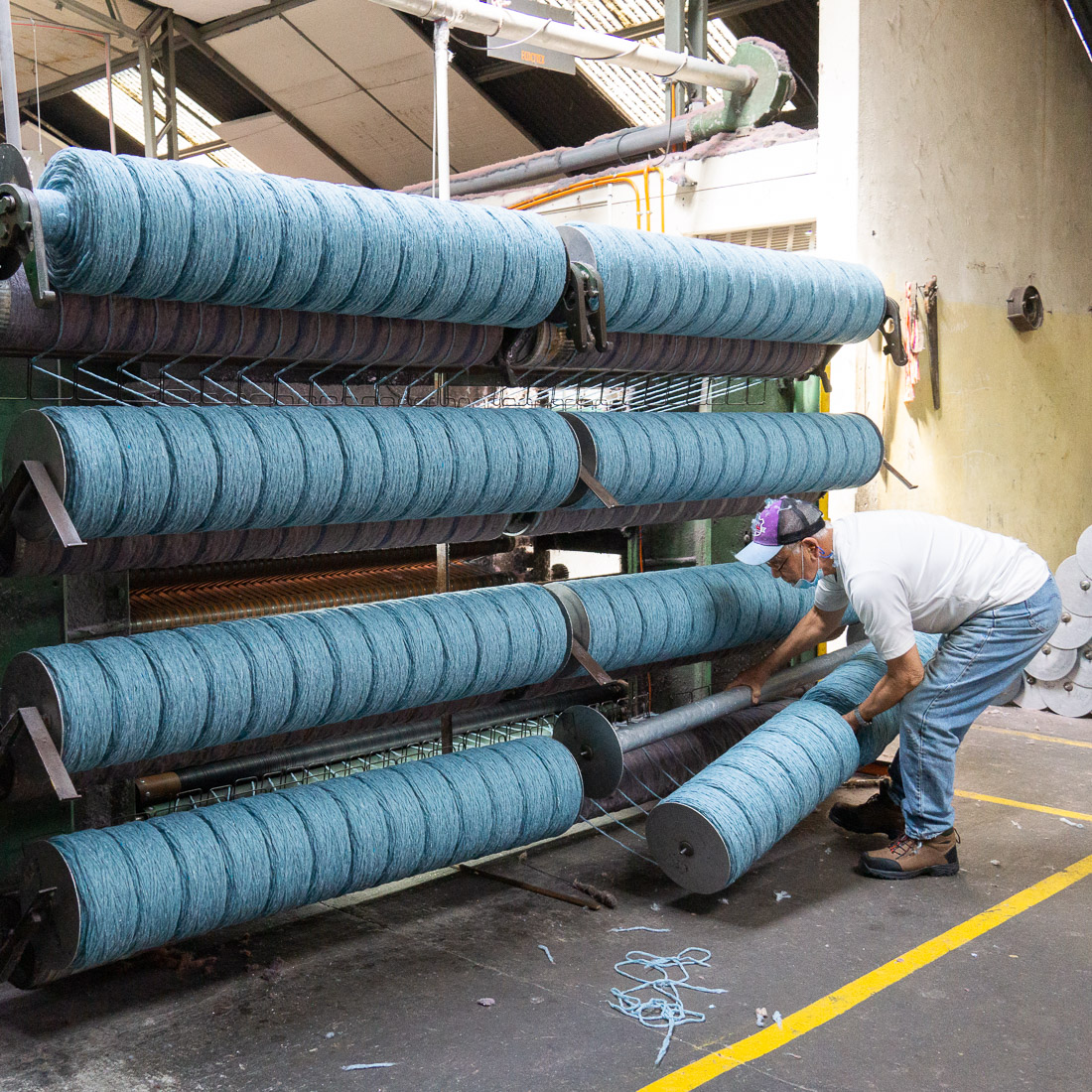 La lana de ropa reciclada se pasa a conos para su almacenaje y venta
