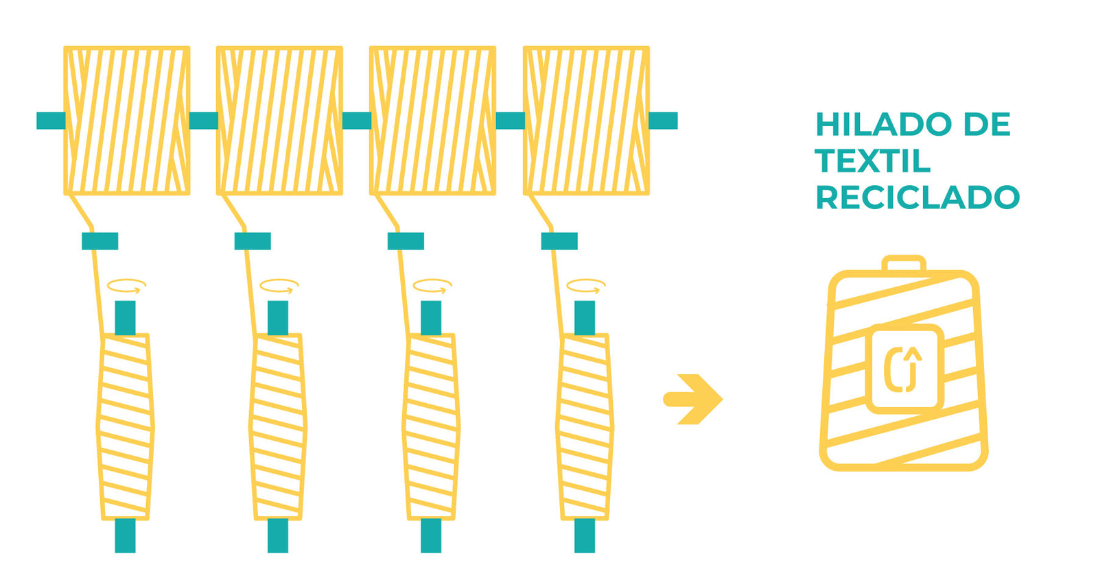 Aplicamos torsión en la continua, para darle resistencia y obteniendo un hilado de ropa reciclada